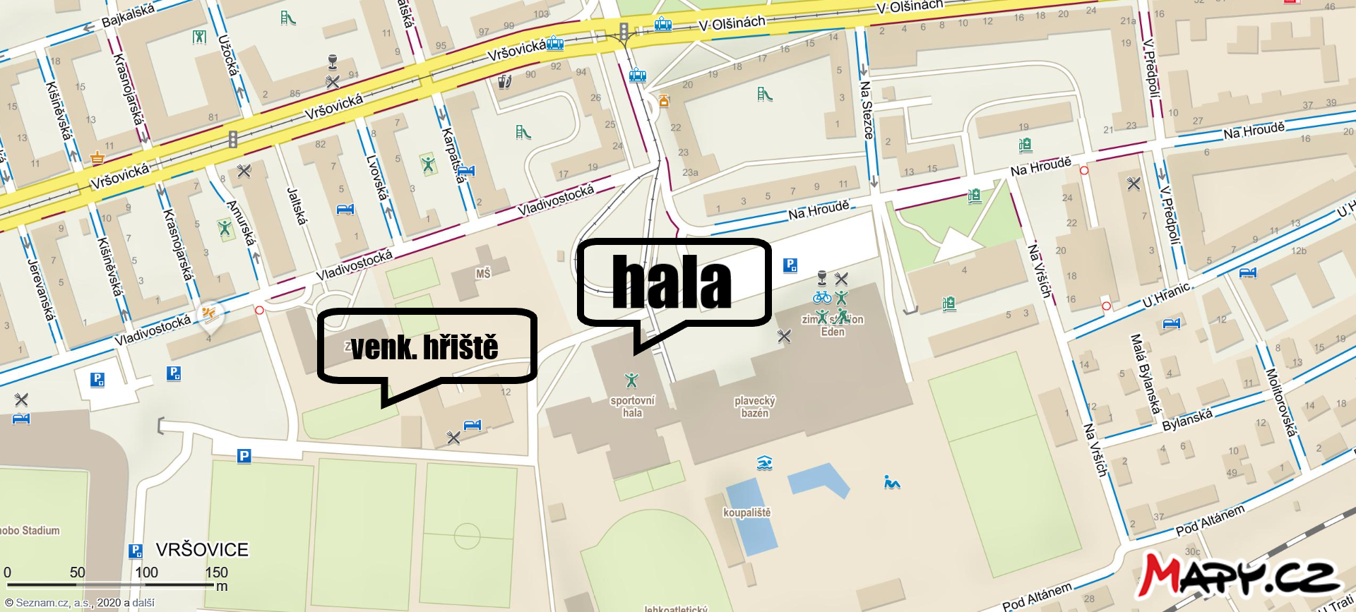 250 m od Haly Eden mezi venkovními tréninkovými hřišti SK Slavia Praha fotbal a ZŠ Eden