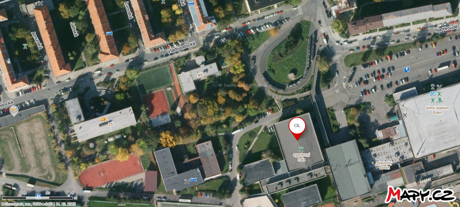 250 m od Haly Eden mezi venkovními tréninkovými hřišti SK Slavia Praha fotbal a ZŠ Eden